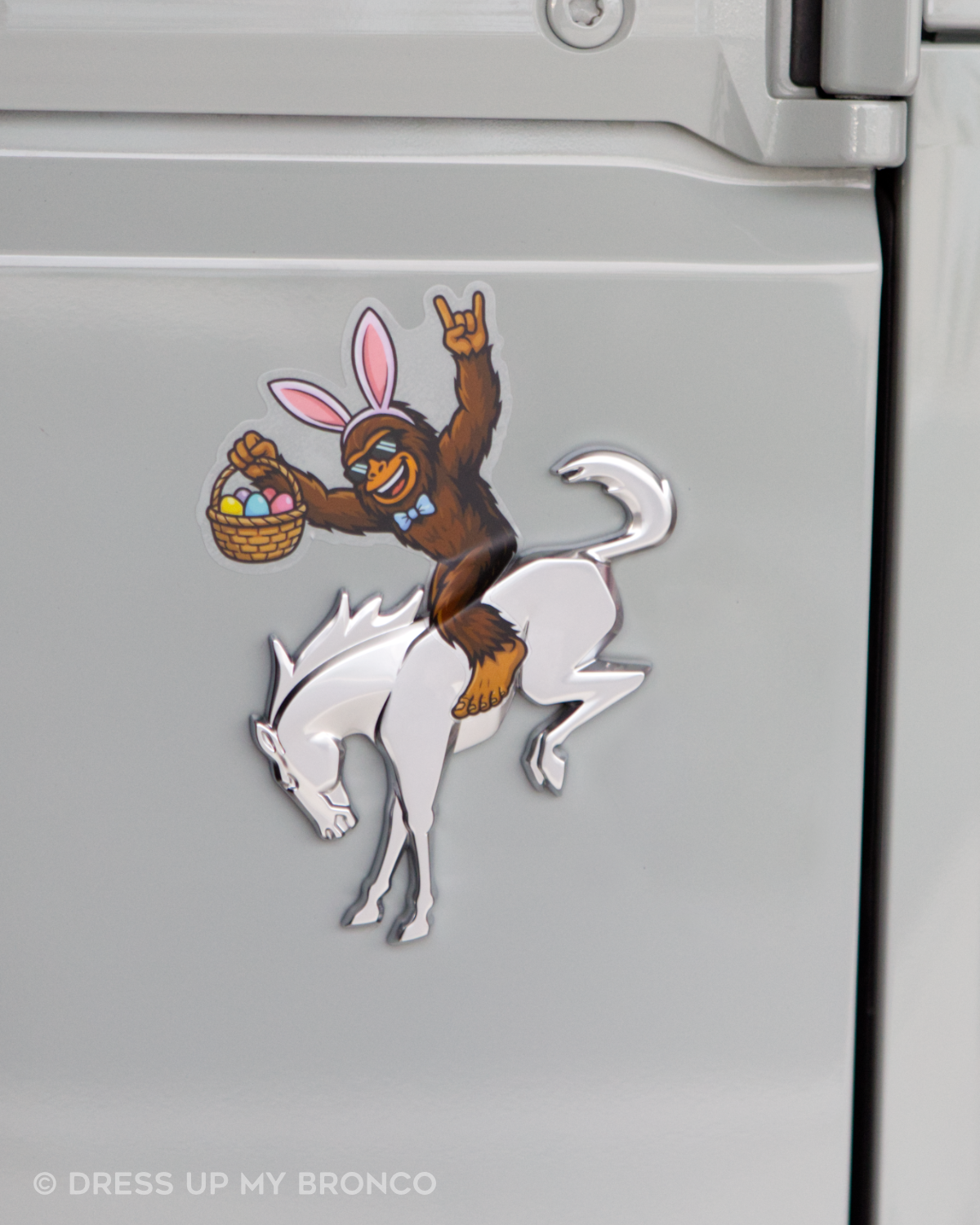 Your Bronco is about to have the funniest Easter upgrade ever. Bronco Egg Hunt Mode features Sasquatch dressed as the Easter Bunny — bunny ears on, bow tie ready, basket of eggs in hand — and it’s designed to sit right over your rear Bronco emblem so it looks like he’s literally riding your Bronco and delivering Easter chaos with a straight face.
